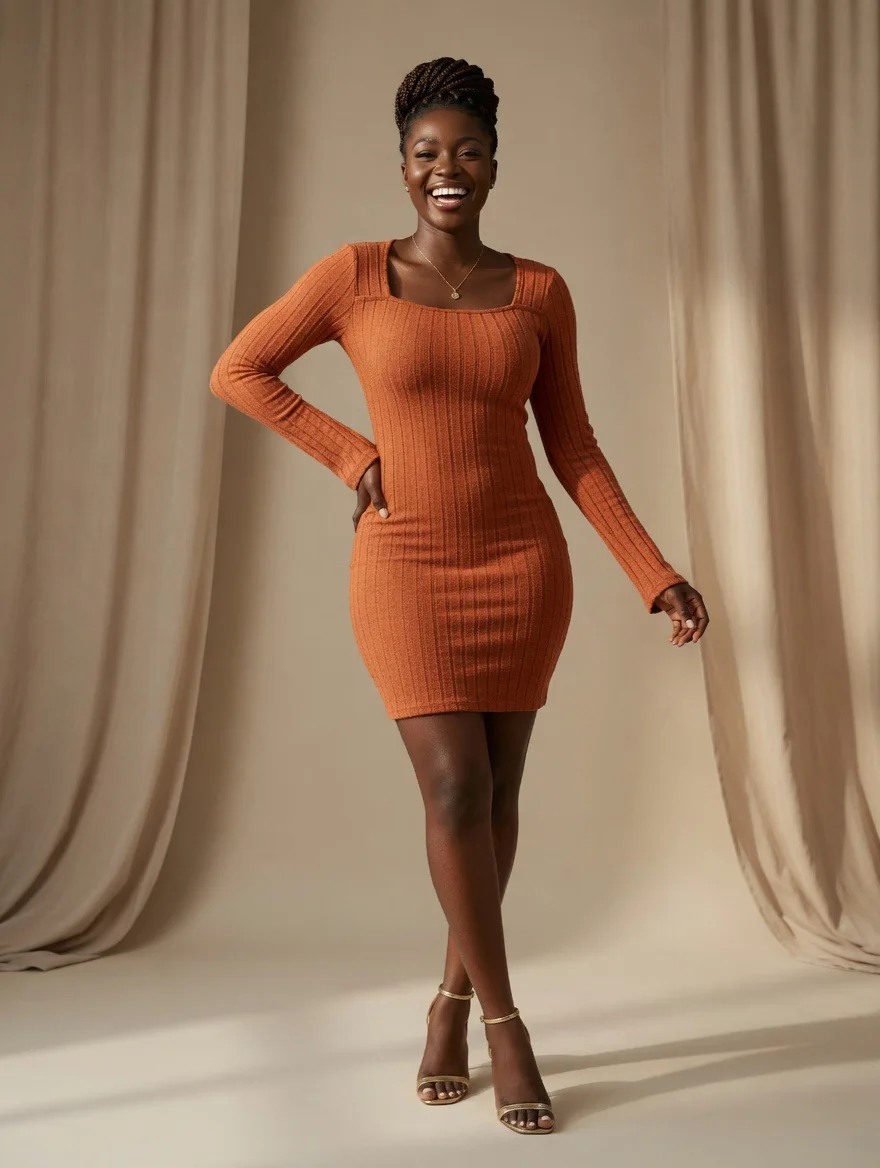 Rust Orange Ribbed Long-Sleeve Square-Neck Mini Dress